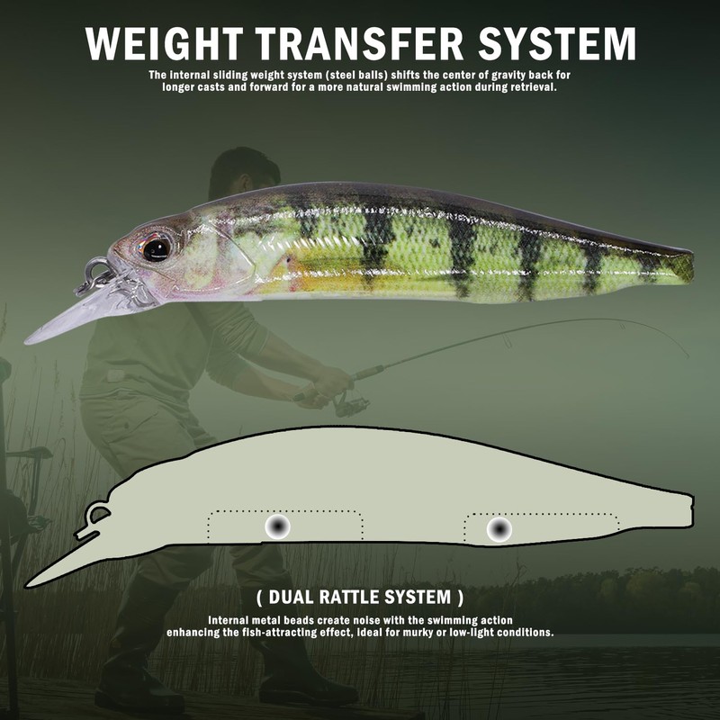 - Built-in metal balls: inside the perch bait set there are steel balls, which ensure precise centre of gravity displacement and significantly improve the casting distance. The special noise design makes the bait more noticeable to fish, while the streamlined body structure ensures effortless placement at the desired fishing point.