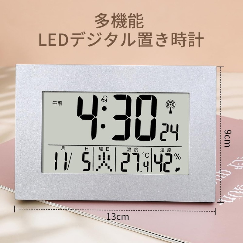 - Product Features: Full auto-calendar function from 2000 to 2099, temperature and humidity display (temperature measurement range: 0 to 50 °C); Measurement accuracy: ±2 °C; Humidity measurement range: 20% to 95%; Measurement accuracy: ±8% (25 °C), radio wave reception function, electronic alarm clock, temperature display, humidity display, calendar display, 12/24 hour display
