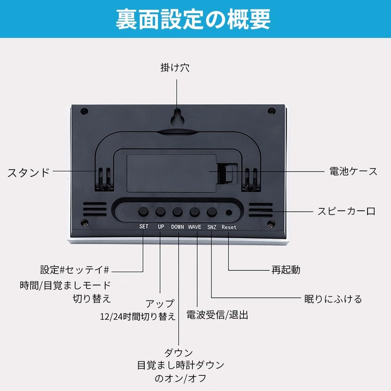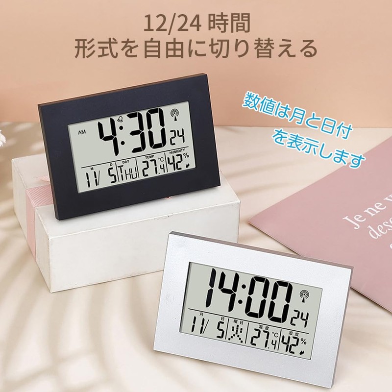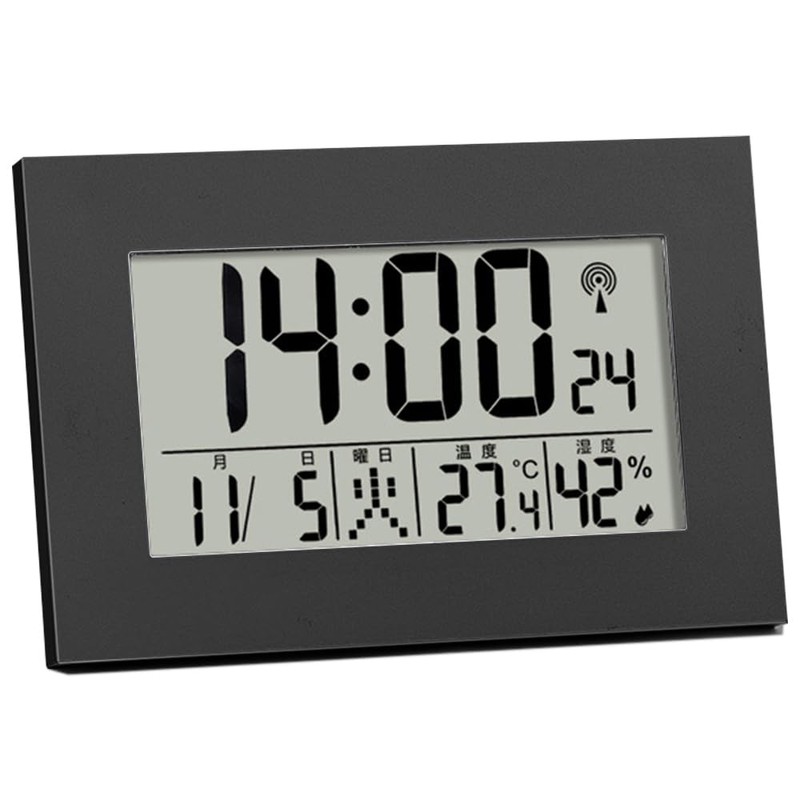 Table Clock, Alarm Clock, Radio Clock, Thermometer, Hygrometer, Digital, Wall Clock, Calendar, Date and Week Display, For Bedroom/Tabletop, Unit Size: 5.1 x 3.5 x 0.8 inches (13 x 9 x 2 cm) (Black)