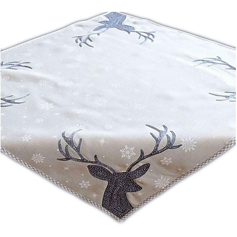 Table Cloth 85 x 85 cm, Light Grey / White / Ice Blue Embroidery ‘Deer’ Christmas, Christmas Tablecloth Centre Table Decoration