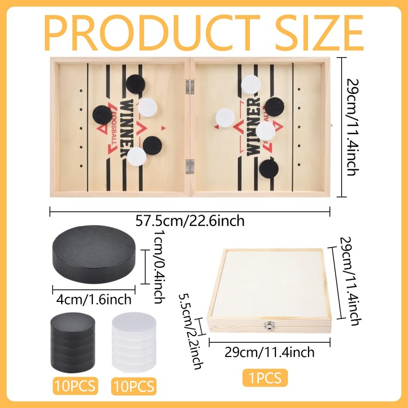 • Portable and durable design: solid wood frame and wooden play pieces. Made of high quality wood, no harm to the body. Environmentally friendly, beautiful and durable. The board will be a box and store all ice hockey after playing, take it anywhere and play, indoors and outdoors