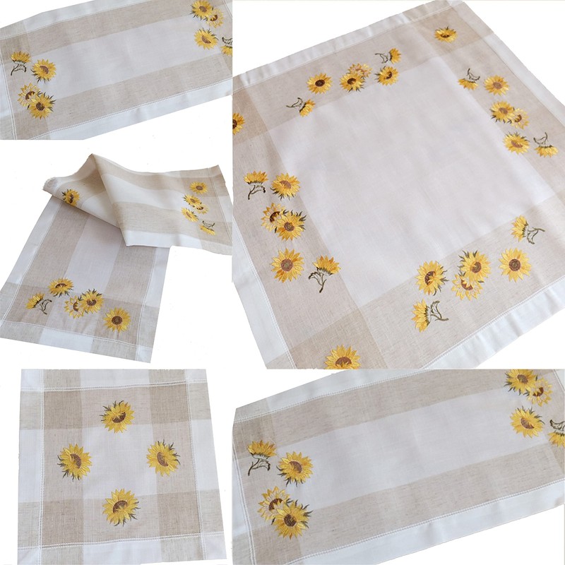 - Embroidered with yellow sun flowers on beige coloured background. The edge is decorated with a light brown wide stripe and neatly hemmed. A real autumn eye-catcher on any table.