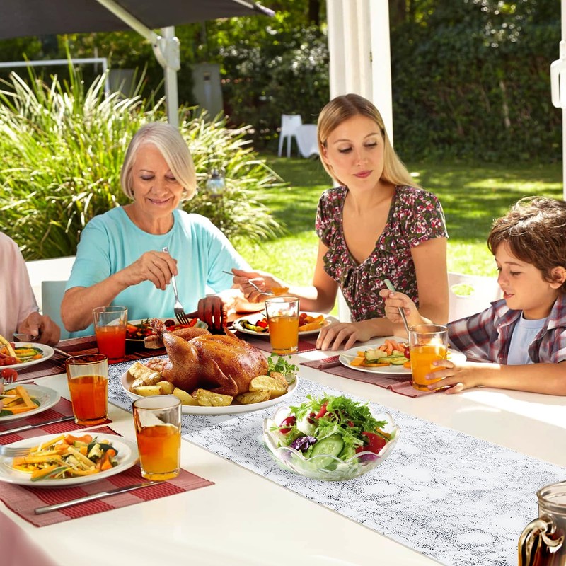 - Nice design: with its bold design and sparkling silver foil flakes, our table runner gives any place a beautiful and elegant atmosphere, especially in combination with a white tablecloth.