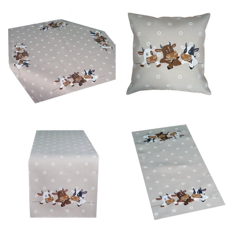 - Funny cows as crank embroidery in brown, white and black on beige light brown background. The fabric is decorated with white flowers. The edge is neatly hemmed.