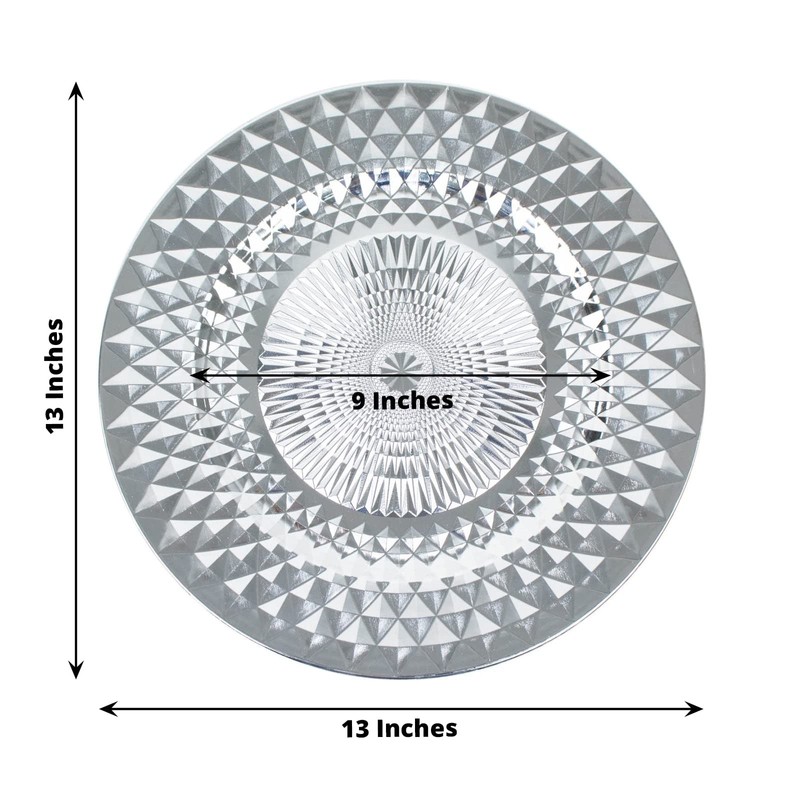 TABLECLOTHSFACTORY 6 Pack | 13" Sparkling Silver Diamond Disposable Dinner Serving Plates, Shiny Round Plastic Charger Plates