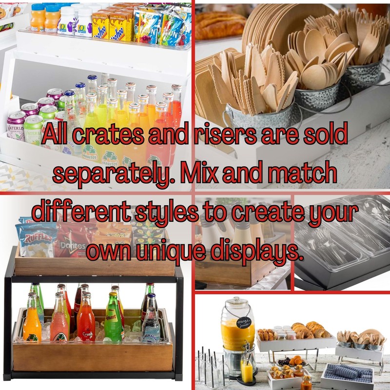 - Adjustable Crate Stands: Adjustable shelves allow you to display your products flat or on an angle, perfect for showcasing baked goods or prepacked food. Ideal for use with the Tablecraft wooden crates for dessert table use or as a produce display.