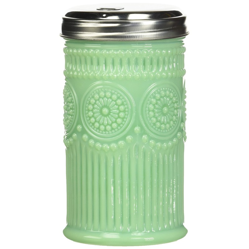 Jadeite sugar shakerdiner-style shape holds enough sugar for the gang, yet The detailing is pretty enough to enhance your table setting, brunch buffet or collectibles shelf. glass with metal screw-on cap; holds 10 oz.