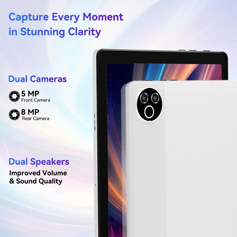 - 【10-Inch IPS In-Cell Display】This tablet PC boasts a 1280×800 high-resolution IPS screen that delivers vibrant, true-to-life colors. Enjoy sharper, brighter visuals for a more immersive viewing experience. The 5MP front and 8MP rear camera can handle video calls and photo recording with ease. LCD touchscreen uses low-blue-light tech to cut down on eye strain from screen flicker and harsh blue light. Slim and lightweight, this 10-inch tablet amps up immersion for all your favorite activities.