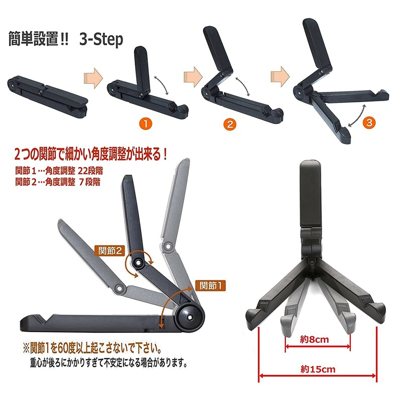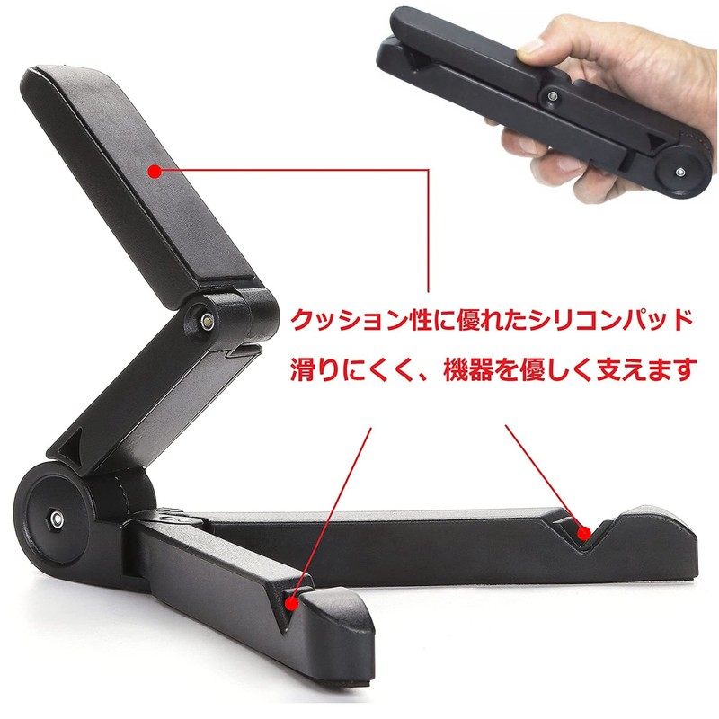 - Lightweight and compact foldable tablet PC stand is a mobile stand with a simple design and functionality. The 2-axis type allows for flexible viewing angles and adjustment to suit your device. The surface supports the device has a V-shaped notch with non-slip pad so you don't have to worry about it falling over. The rear support part that touches the back of the device is equipped with a silicone rubber non-slip pad, so the device does not slide easily when you operate the touch panel on your tablet or smartphone. This tripod type has a high stability yet is lightweight and compact enough to fit in the palm of your hand when not in use, it is not only lightweight, but also takes up much space when not in use. If you can adjust the position of the charging cord and outlet port, it can also be used as a charging stand (cradle). Since it is not a magic arm, the height cannot be adjusted (ground height). This is not a magnetic fixed type (with magnets). This is not a suction cup type