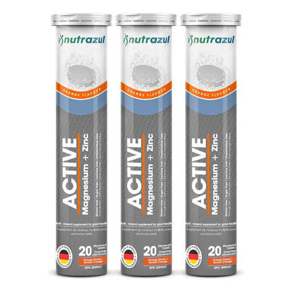Tabletas efervescentes Nutrazul ACTIVE (Magnesio y Zinc) - Naranja (Paquete de 3 X 20) | Suministro para 60 días | Sin gluten, sin azúcar, sin lactosa y sin conservantes | Apoya la recuperación muscular | Mantiene el equilibrio normal de electrolitos