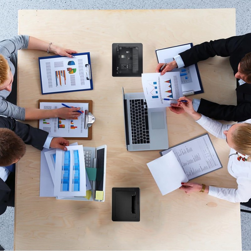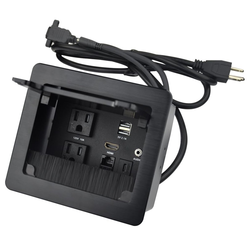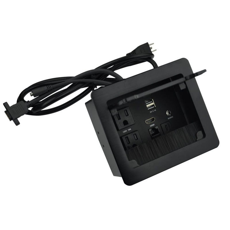 Tabletop Brush Flip Connectivity Box with 2 AC Power + 2 USB Charger + HDMI + 1 3.5mm Audio + USB-C Data + RJ45(cat6) for Conference Room (Black)