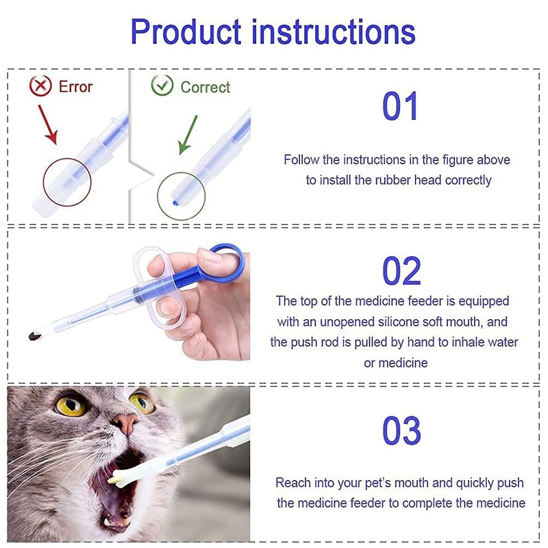 - 【Gebrauchsanweisung】Setzen Sie eine Pille an die Spitze des Tabletteneingeber Katze ein oder füllen Sie flüssige Medikamente in den Zylinder. Platzieren Sie Zeige- und Mittelfinger unter den Fingerlingen des Pillenfütterers. Öffnen Sie das Maul des Haustiers mit einer Hand über dem Kopf und dem Schnauzenbereich. Üben Sie Druck mit den Fingern an beiden Seiten des Kiefergelenks aus.Führen Sie den Pillenfütterer über die Zunge und in den hinteren Teil des Mundes ein