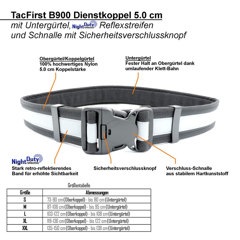 TacFirst Service Belt Black Police Security BW Emergency Service with Velcro Lower Belt, Nightduty Reflective