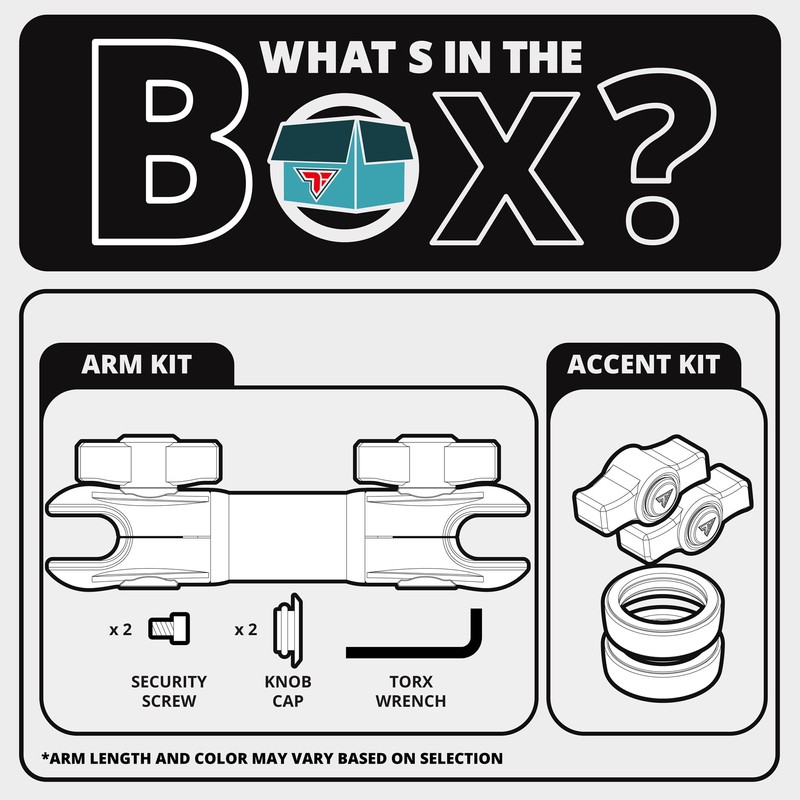 - INCLUDED COLOR ACCENT KIT: Each accent kit consists of (2) CNC Machined Aluminum Knobs (with optional Anti-Theft) and (2) CNC Machined Aluminum Accent Rings. Please Note: Each arm is shipped with our sleek black accent kit as a default, offering you the versatility to match different vehicles and color schemes. To install your color accent kit, simply clip the accent rings on the end of the Arm and swap the machined aluminum knobs.