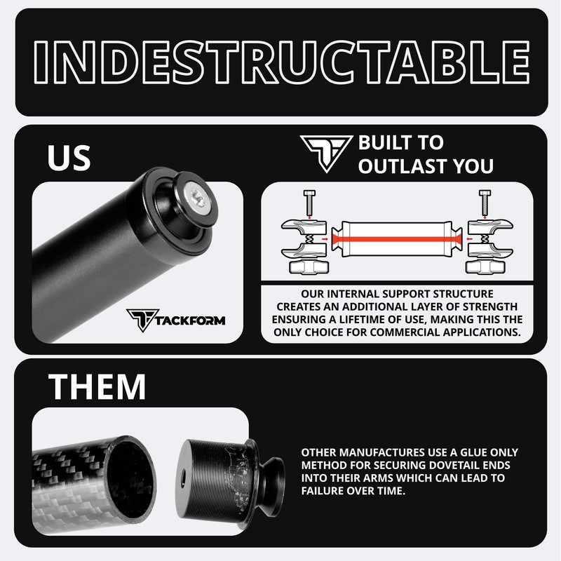 - INDESTRUCTIBLE: Yep we said it. Where most Aluminum tube arms have the sockets simply glued into the ends, making failure over time a likely event, ours will never fail. The reason is simple. Quality Engineering. We designed and internal support system that ties the two dovetail/socket ends together, offering a solution you can rely on. If you have more than one vehicle in your fleet, and failure is not an option, Tackform is your only choice.