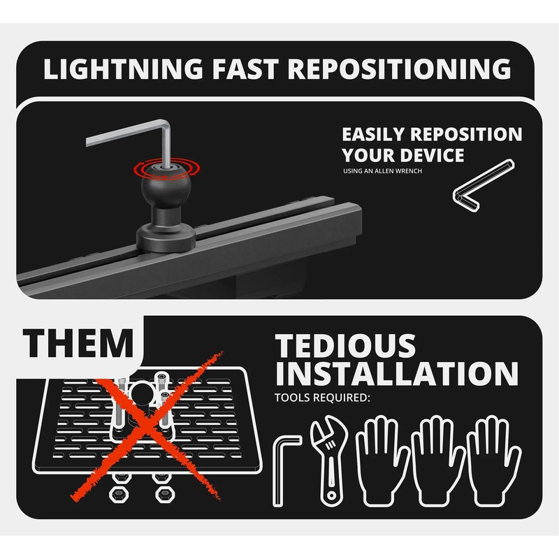 - LIGHTNING FAST REPOSITIONING: While 'grid-style' dash mounts are trendy, they can be a nightmare when trying to install, move, or reposition your mounting bases. With our intuitive Slim Track system, you’ll never have to fumble with nuts again. Capable of comfortably holding up to four devices, the Slim Track system features a CNC-machined top plate with an integrated track system, allowing you to quickly add, remove, or reposition your mounts in seconds.
