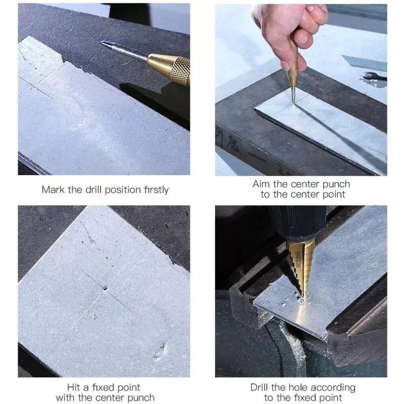 50 SIZES IN 5+1: The step bit set includes five standard step drill bits that can replace 50 individual drill bits, let you process 50 different kinds of diameter holes with the five pieces, Extra center punch marks work piece with a dimple, creating a starting point that prevents screws and drills from wandering