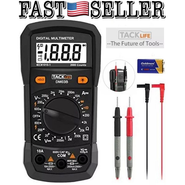 The Tacklife DM03B Digital Multimeter is a practical tool for electricians, hobbyists, and general household use. The manual range dial makes it easy to select a range to measure current, voltage, and resistance—perfect whether for new electrical engineering students or pros who prefer setting the dial. It also comes equipped with a continuity buzzer to ensure your electrical components are still in working condition. Other features include a low battery indicator, overload protection, removable test lead extension caps, and a tough rubber sleeve to protect it from drops that may happen while on the job.