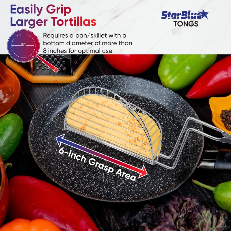 - 6-INCH GRASP AREA FOR BETTER CONTROL – Designed with an extra-large 6-inch grasp area, these tongs securely hold larger tortillas, ensuring stability and ease of use while frying. For optimal performance, use with a skillet or pan with a bottom diameter larger than 10 inches.