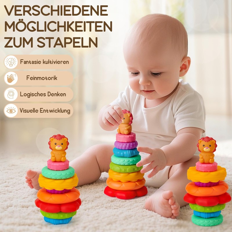 - RAINBOW STACKING TOY This stackable teething toy consists of eight different sized circles and a cute lion. The rainbow coloured surface attracts baby's attention, and the irregular patterns and designs promote the sense of touch. A great sensory toy for babies aged 6-12 months!