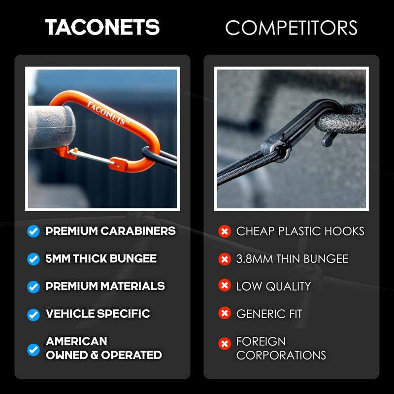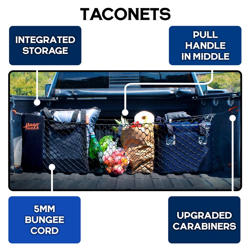 - QUICK INSTALLATION CARABINERS: Every TacoNet cargo net includes 4 strong carabiners, so it's easy to attach all 4 sides of the net to the truck bed; these nets use thick, robust hooks