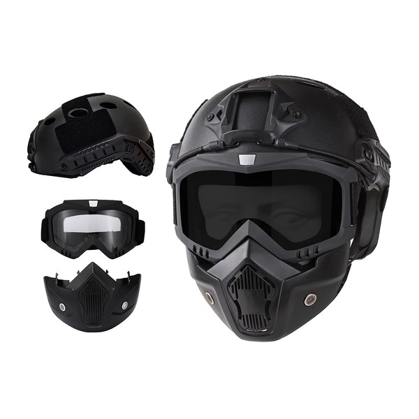 Tactical Airsoft Helmet and Full Face Mask with Removable Goggles with NVG Mount Front and Side Rail PJ FAST Helmet