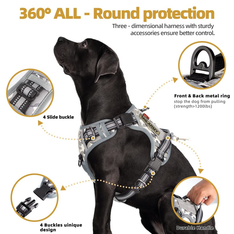 2. Good visibility is important for those who like to walk at night. This military dog harness has reflective strips on the edges and straps of the vest to stay safe at night.