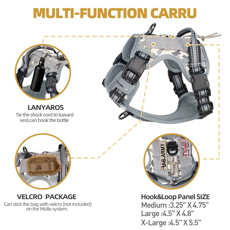 - MOLLE System & Tactical Harness:The molle system is equipped on both sides of the tactical dog harness for bags and outdoor gear, which allows dogs to carry training accessories, water bottles, tactical dog gear, etc. You can attach personalised badges and morale patches to the Velcro surfaces, attach a custom sticker on the back.