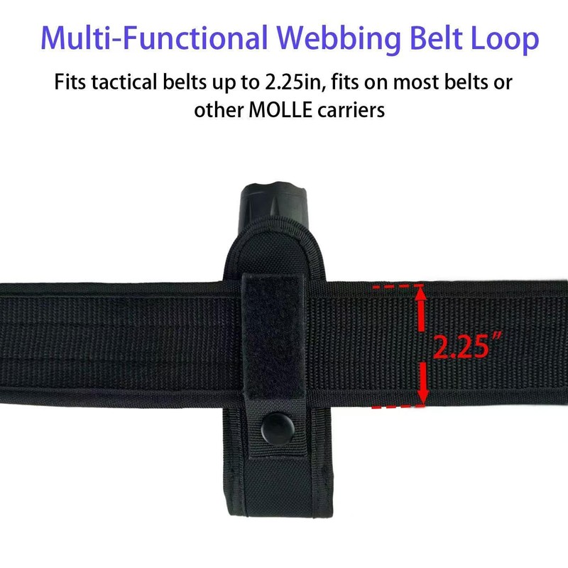 - APPLICATION: Belt loops securely attach the flashlight holster to duty belts (up to 2.25 inches wide) and backpacks (vests/backpacks) with Velcro and brass buckles. SPECIAL NOTE: Adjustable Velcro fasteners securely attach the flashlight to duty belts sized 2 to 2.25 inches (if the duty belt is thicker), and duty belts not larger than 2 inches can be securely fastened with Velcro and brass buckles.