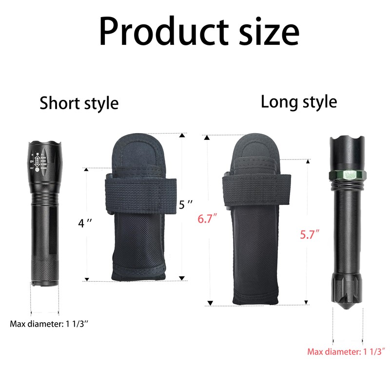 - Note: Flashlight not included. SIZE: This flashlight bag fits most flashlights up to 1-1/3 inches in diameter. Please make sure the diameter and height of your flashlight is less than or equal to the diameter and height of our flashlight bag. Please be sure to check the dimensions of your flashlight before purchasing and compare them to the data we provide. Height: front: 4 inches, back: 5 inches.