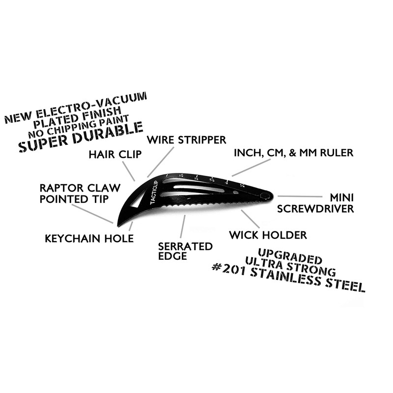 Tactical Hair Clips, 4 Pack - Black - Multitool Snap Barrettes - Laser Engraved, Vacuum Plated, Multi-Functional Keychain Multi Tool - Box Cutter, Serrated Edge, Raptor Claw