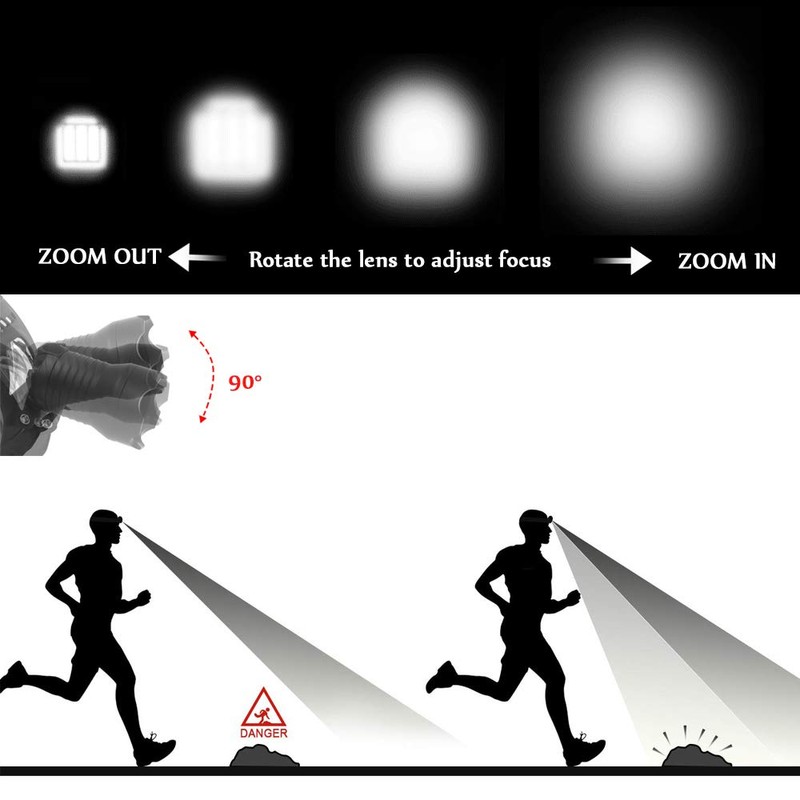 - ZOOMABLE AND 90 DEGREE ROTATION: Fully zoomable from wide to narrow beam. This hunting headlight goes much farther than ordinary headlights while staying bright. The head swivel can be 90 degrees rotated, pivoting headlamp lets you point the beam where you prefer.