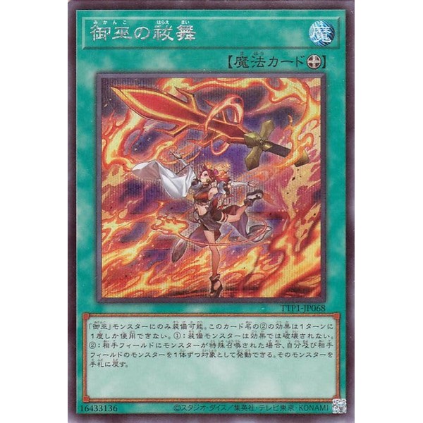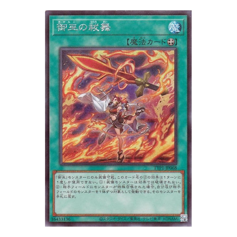 - ★遊戯王 OCG デュエルモンスターズ 「TACTICAL-TRY PACK -黒魔導・HERO・御巫-」(TTP1)収録 ■カード名:御巫の祓舞 ■Yu-Gi-Oh! TCG Card Name:Mikanko Purification Dance 【装備魔法】シークレットレア ■「御巫」モンスターにのみ装備可能。 このカード名の(2