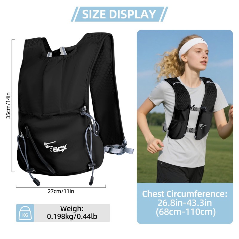 - Ergonomic and Adjustable Design: Water pack backpack has easily adjustable chest and waist straps, suitable for chest sizes between 26.8in-43.3in. Hydration pack's straps is tightened from the shoulders to the waist, reducing swinging and ensuring excellent fit during running