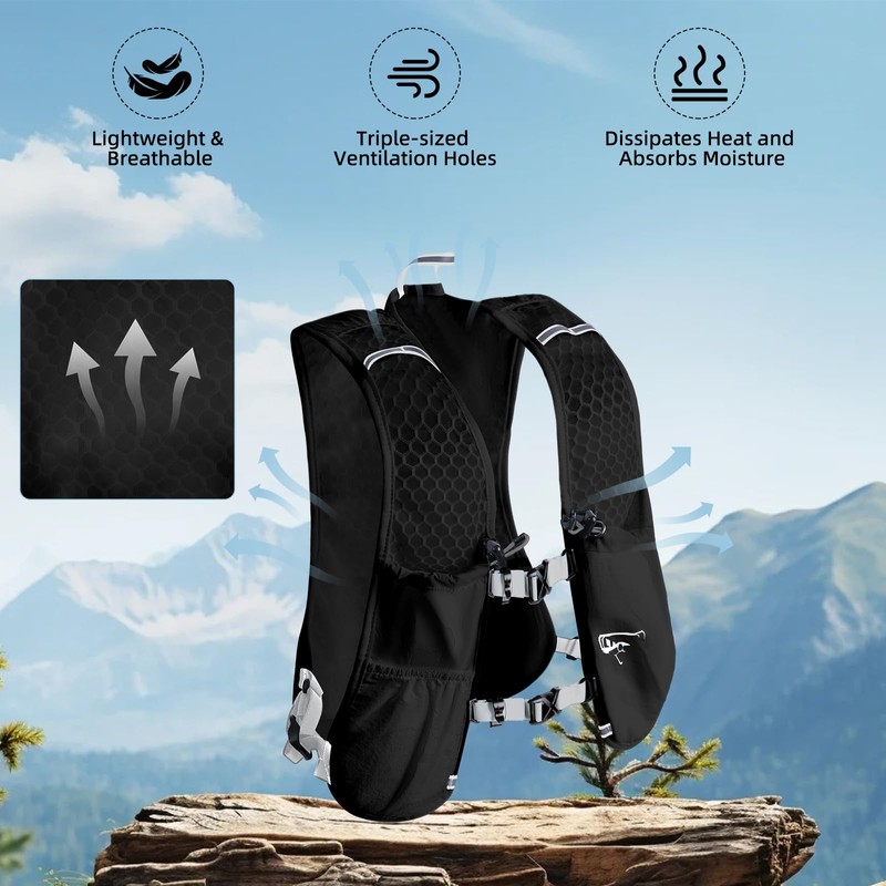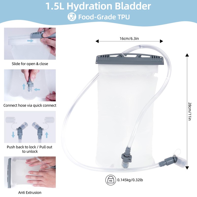 - Includes Water Bladder: Running backpack includes a 1.5L food-grade TPU water bladder, saft abd with leak proof protection. Trail running vest has a straw design, freeing up hands, is the perfect sports equipment to replenish moisture while hiking, cycling, climbing or any outdoor adventure