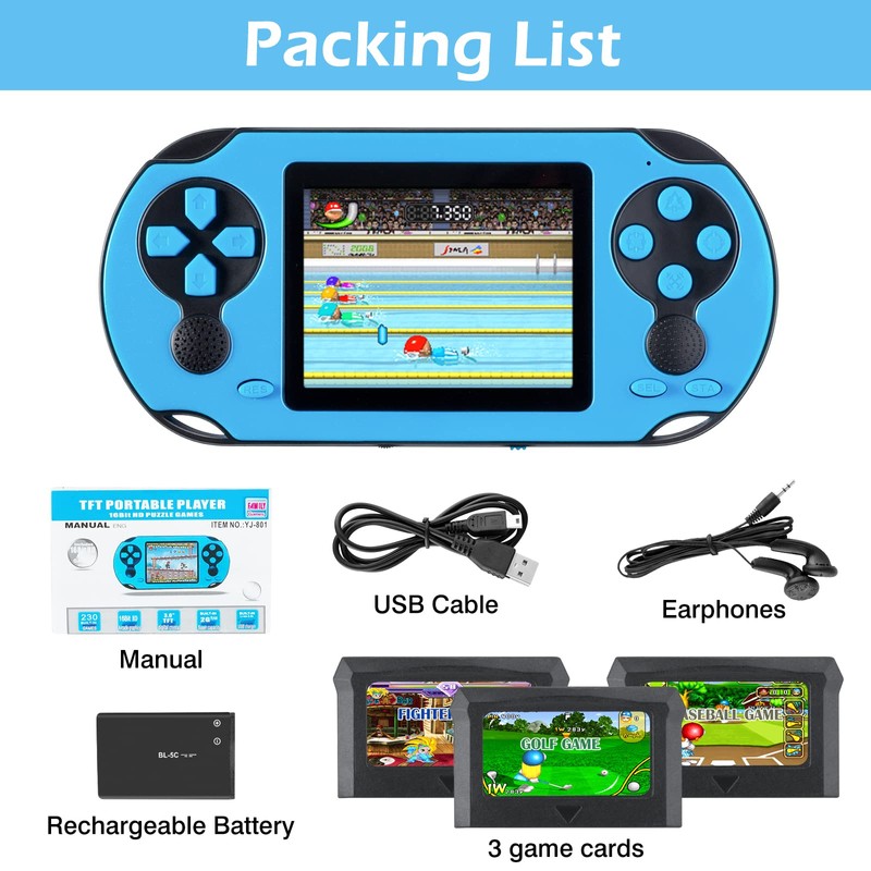 - Brand New Game Console: This handheld video games built-in 230 newly designed educational puzzle and leisure, racing, fighting, adventure games without repetition. Also comes with 3 game cartridges, each with a separate classic game. Have fun playing the game console while they work on important developmental skills such as hand-eye coordination, thinking and problem-solving skills