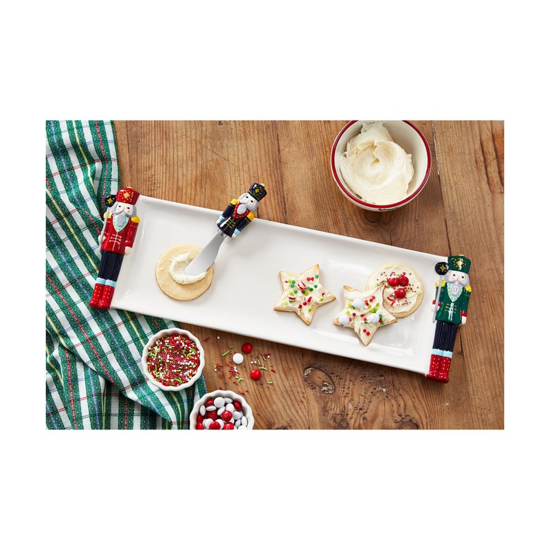 tag Holiday Nutcracker Accented Solid White Rectangle Earthenware Dishwasher Safe Serving Platter with Nutcracker Handled Cheese Spreader, 19L x 5.9W in White