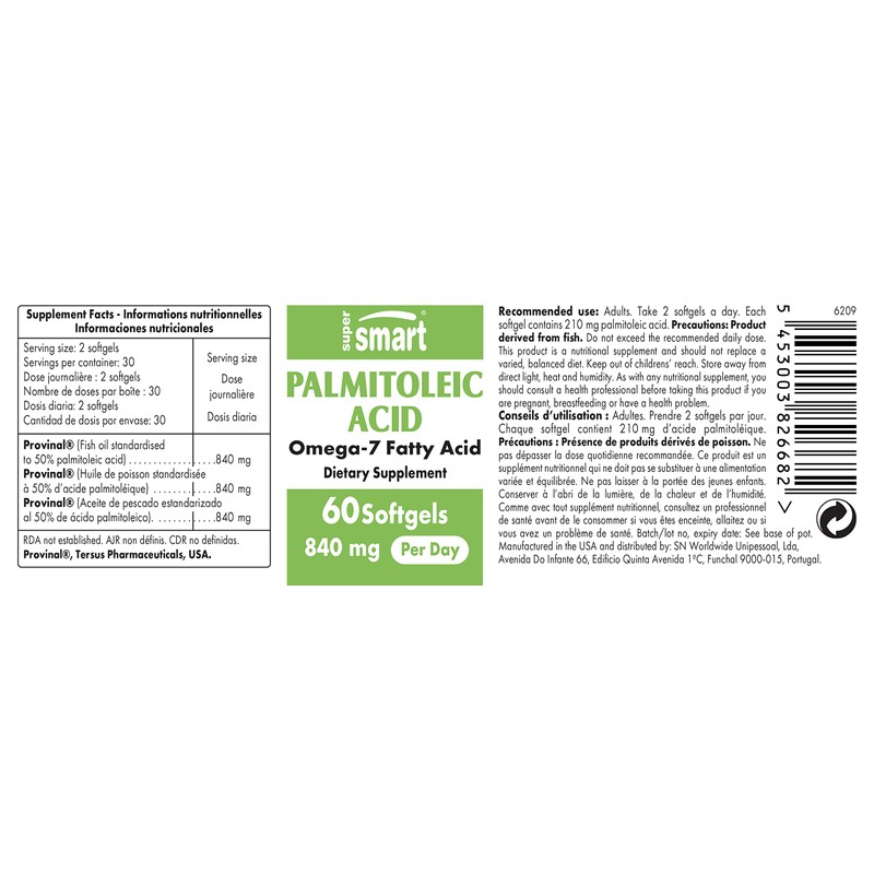 Täglich 840 mg Palmitoleinsäure - Patentiertes Omega 7 (Provinal®) - Aus Fischöl - Hautpflege - Unterstützt den Cholesterinspiegel und schützt das Herz - Glutenfrei - Von Supersmart