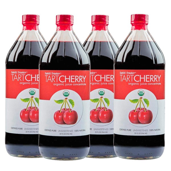 TAHITI TRADER Tart Cherry Juice Concentrate - Ready to Drink Organic Superfood Juice Promoting Immune Support & Overall Health - Pure, Unsweetened Fruit Juice - (32 oz, 4 Pack)