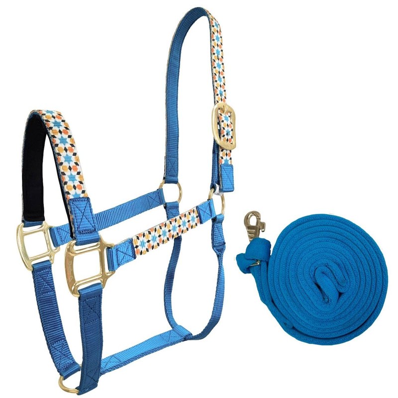 - COMES IN 6 FUN NEW PRINTS - these horse halters are available in Blue Aztec on Black Nylon, Blue Chevron on Hurricane Blue nylon, Geometric on Hurricane Blue nylon, Grey Floral on Pink nylon, Paisley on Charcoal nylon, and Red Aztec on Red nylon.