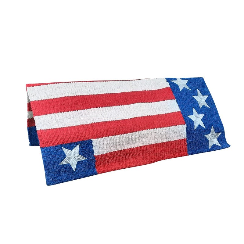 Show off your patriotic pride with this American Flag saddle blanket. Complete with red, white, and blue stripes and white stars.