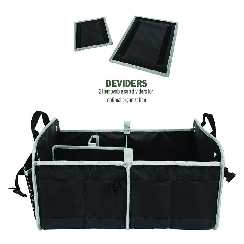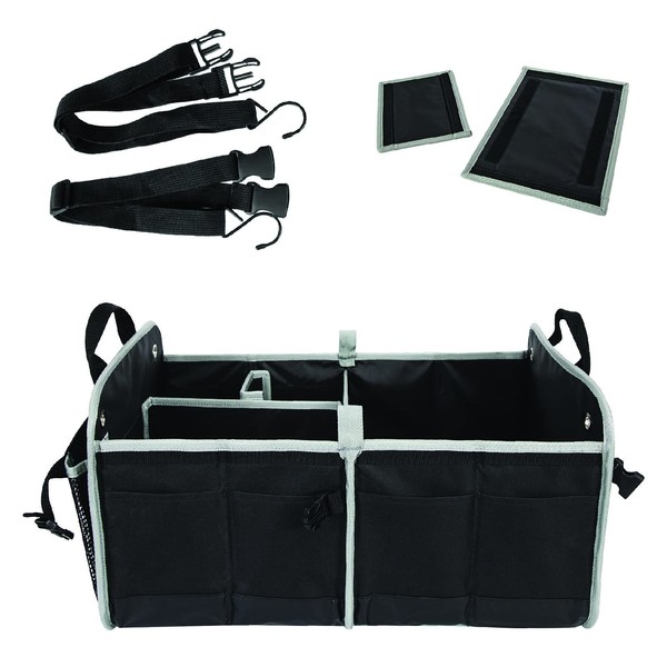 Tahoe Trails Collapsible Car Trunk Organizer - Portable Trunk Organizer with 4 Compartments, Multi Exterior Pockets, 2 Tie-Down Straps, Non-Slip Bottom (Black) - Great for Auto, SUV, Truck, and Sedan