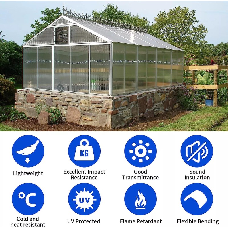 Polycarbonate roof sheets can be used for greenhouse, swimming pool roof, outdoor canopy, plant support roof, garden fence, aisle roof, etc.