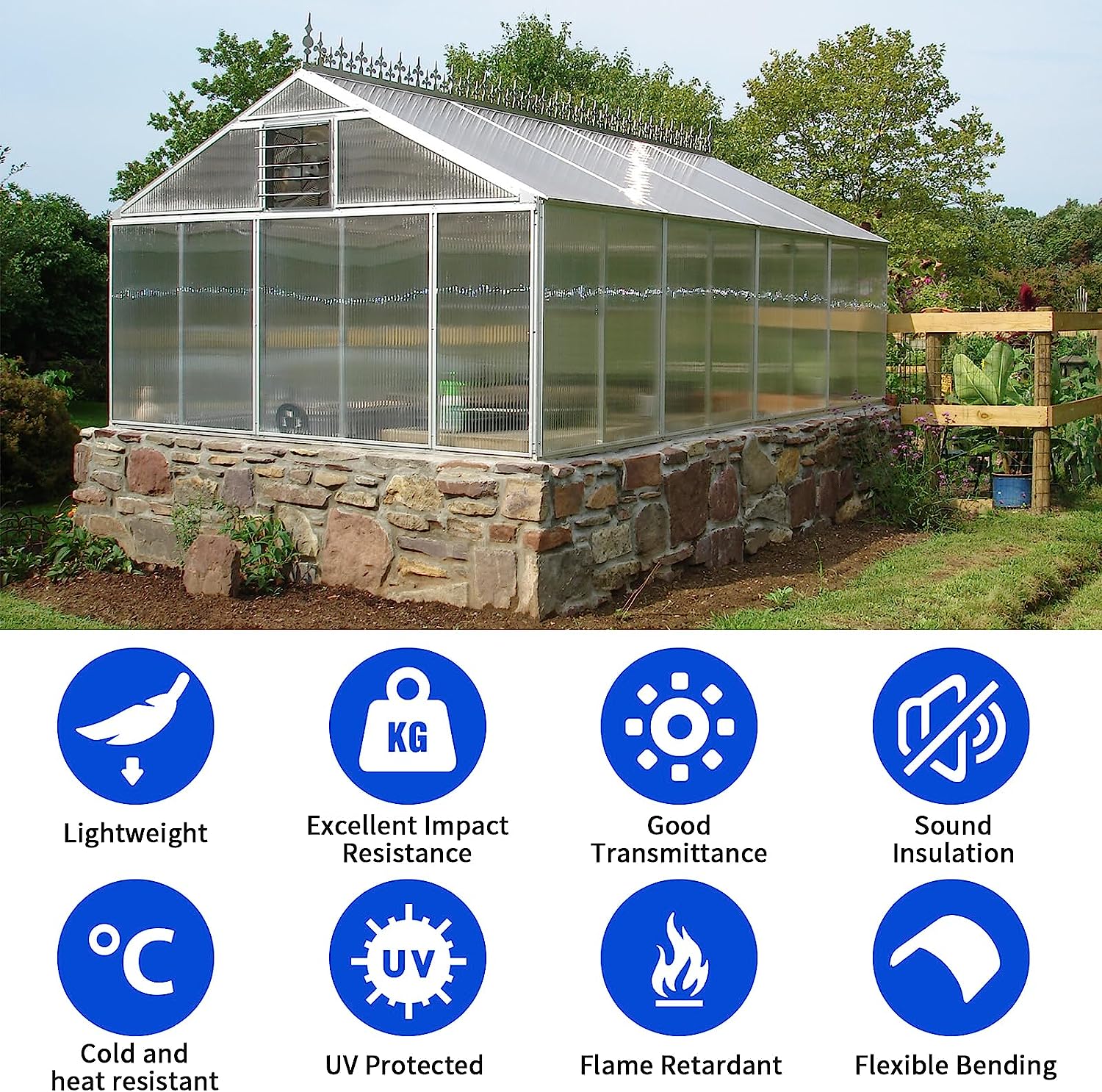 Imported material from German Bayer -- more solid and more durable -- efficiently improves greenhouse panel’s intensity and ability of impact resistance. It also passed FDA certification, high quality assured.