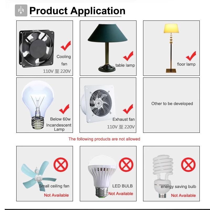 - Nota: el atenuador LED no es para usar en lámparas de pie, lámparas de mesa e iluminación de temporada que excedan el vataje especificado y no son compatibles con electrodomésticos o ventiladores