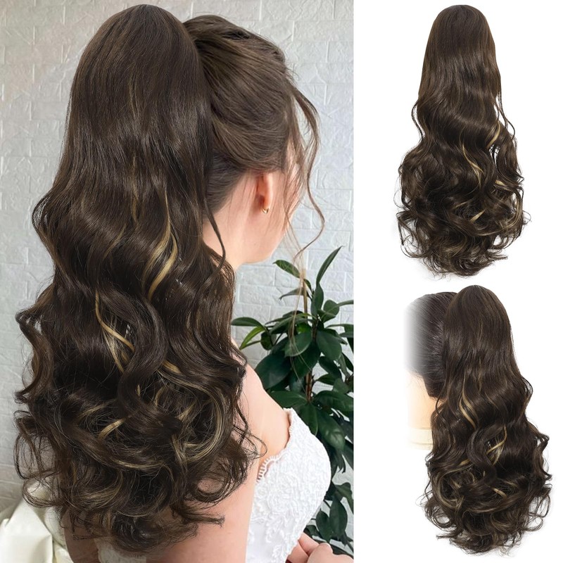 Taifeng Claw Clip Ponytail Extensions,18inch Curly Wavy Pony Tails Hair Extensions, Synthetic Clip in Ponytail Hair Extensions for Women(Color: Light Brown With Golden Highlights)