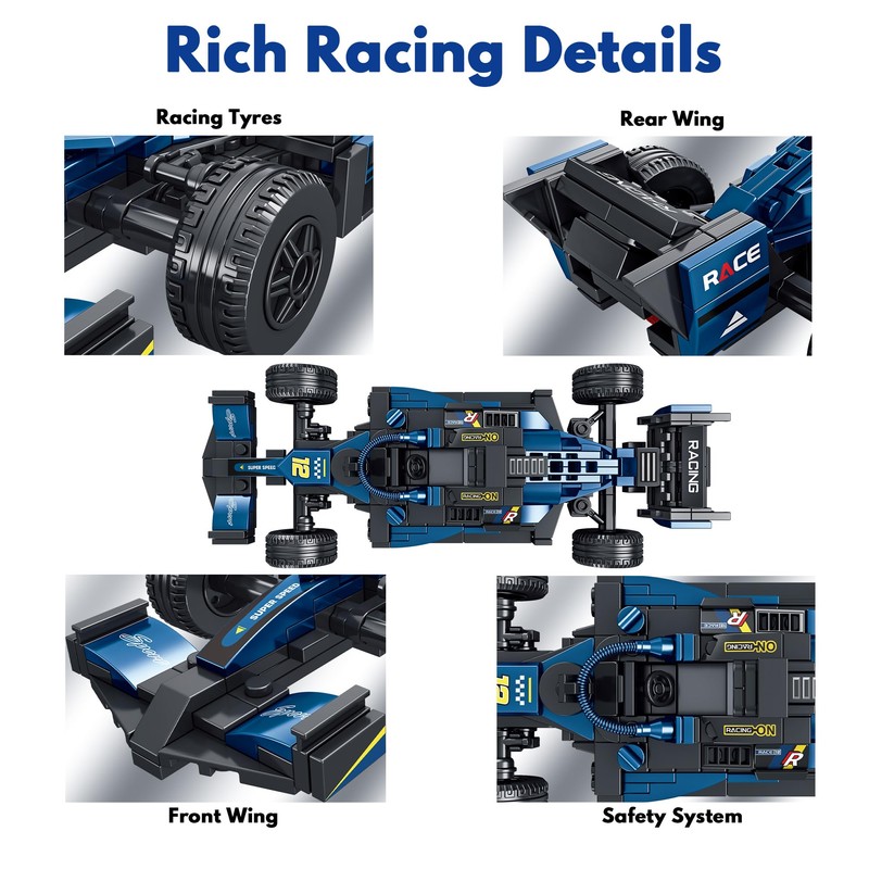 - IMITATED MODEL DESIGN. This racing car building block model set meticulously replicates the elegant sleek lines and key structures of a speed car, including the front wing, rear wing, and safety systems. As you assemble it, you'll experience the exquisite design of a human-engineered speed wonder