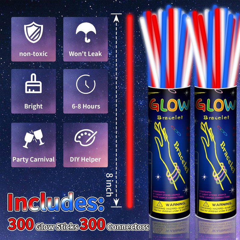 - 4th of July Glow Sticks: This glow party pack includes 300 pieces of 8 inch glow sticks in vibrant red, blue, and white colors, along with 300 individual connectors. Ideal for making glowing bracelets and necklaces, this set is perfect for Independence Day celebrations, birthdays, weddings, Halloween, Christmas, New Year's, and more.