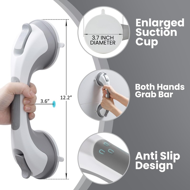 TAILI 12 Inch Shower Grab Bar for Shower, Grey Suction Cup Grab Handles for Seniors, Bathroom Safety Handle, No Drilling Removable