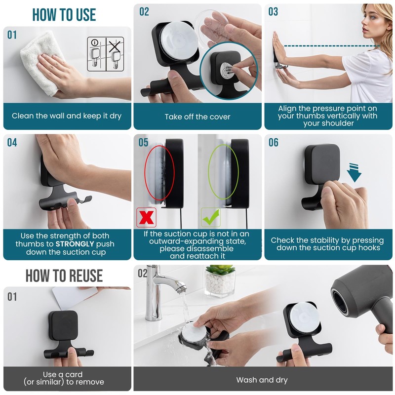 - 1-Sekunden-Installation: Die Badezimmer Handtuchhaken zeichnen sich durch ihre einfache und schnelle Montage aus, ohne die Wand zu beschädigen. Kein Bohren, kein Kleben, kein Schrauben, kein Werkzeug! Wählen Sie einfach eine glatte und trockene Oberfläche und drücken Sie den Haken an die Wand, bis Sie ein "Plopp"-Geräusch hören. Das bedeutet, dass die Installation abgeschlossen ist!